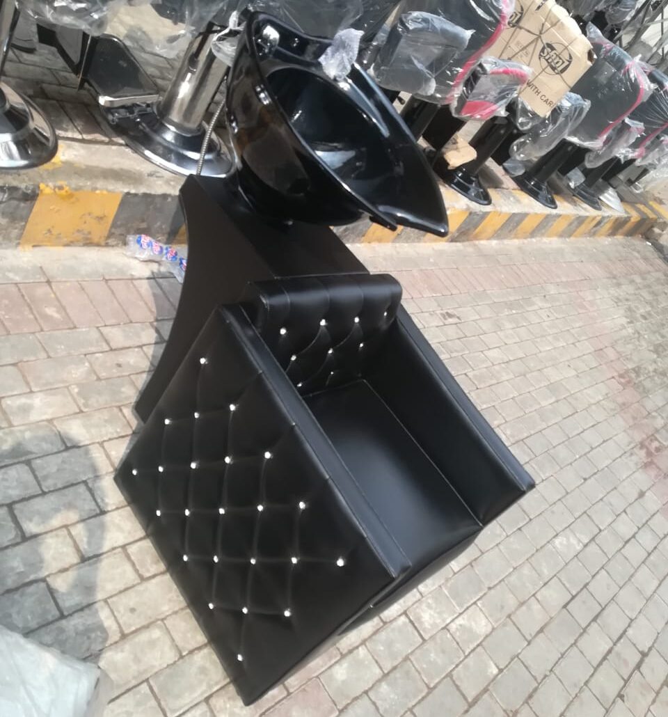 High-Gloss Ceramic Basin: Equipped with a deep, oversized black ceramic wash basin that is designed to prevent splashing and accommodate all hair types and treatments.