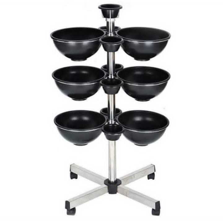 Six High-Capacity Tint Bowls: Features a vertical, three-tier rotating system that holds six full-sized coloring bowls, allowing multiple formulas to be prepared and accessed simultaneously.